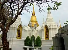 Among the many monuments in the grounds are four prominent white buildings, each dedicated to one of King Chulalongkorn's four principal wives. They also contain the ashes of descendants of the wives to whom they are dedicated. These four structures are listed below with their designated memorial numbers in parentheses. The interred include: