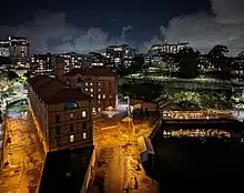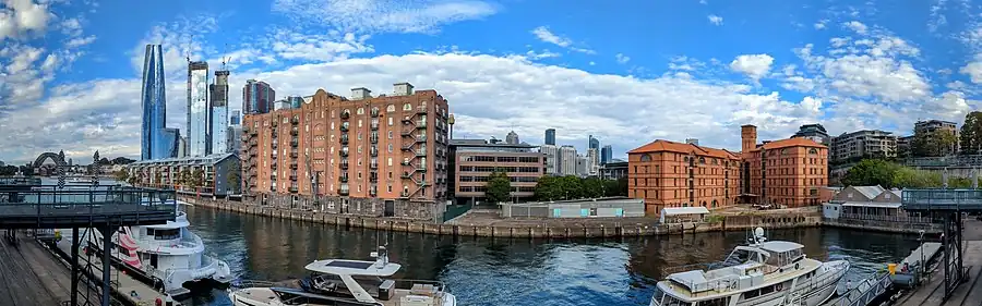 The former Royal Edward Victualling Yard is located in an historic waterfront location on the southern shore of Sydney Harbour at Pyrmont. The height of the buildings and their unusual spatial arrangement result in a dramatic landmark amongst a mixture of historic and recent residential and commercial developments, many of which are on a large scale themselves. A community park opposite the site creates a visual corridor through to the harbour east of the site. The verticality and dramatic waterfront location invests REVY A, B and C with landmark qualities and aesthetic significance. REVY C, the tallest building at Darling Island and on the eastern foreshore of Pyrmont, it is a prominent landmark visible from surrounding vantage points at Sydney Harbour and contrasts with the lower and elongated wharf structures such as Jones Bay Wharf.[1]