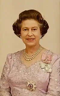 ![]() Queen Elizabeth II wearing the Royal Family Order of George V (below that of George VI) | |