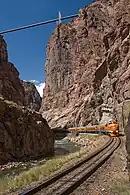 The road leading to and across the bridge from Route 50 is designated as Fremont County Road 3A and begins about 10 mi (16 km) west of Cañon City.[16] The Royal Gorge Route Railroad runs under the bridge along the base of Royal Gorge.[17]