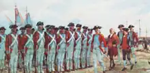A detachment from Régiment de Walsh-Serrant served as marines aboard John Paul Jones ship Bonhomme Richard.[17] When John Adams arrived to Lorient as American Commissioner in 1779, he was given a dinner by Jones and after the dinner he reviewed the ship's marines from the Walsh Regiment.[18] Drafts from the regiment participated in the Siege of Savannah in 1779.[19]