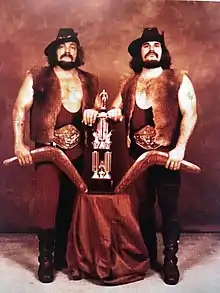 Cousins Jonathan Boyd and Norman Frederick Charles III both came into the pro wrestling world with a solid amateur background behind them.[2] Initially they wrestled in singles competition but a few years after their debut they decided to team up and head to North America. The two became known as The Royal Kangaroos, a name inspired by the legendary tag team the "Fabulous Kangaroos."[1] Like the original Fabulous Kangaroos (Al Costello and Roy Heffernan) who were despised heels and started riots wherever they appeared, Boyd and Charles were vicious rulebreakers. Boyd and Charles worked mainly for Pacific Northwest Wrestling in Oregon, capturing their first NWA Pacific Northwest Tag Team Championship from Kurt and Karl Von Steiger on 11 July 1971,[3] their first reign lasted only 6 weeks before losing the titles to Frankie Laine and Big Snuka. The Kangaroos regained the titles and held on to them by hook or by crook until Dutch Savage and Beauregarde defeated them on 26 November 1971.[3]