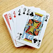 Royal Marriage is a patience or solitaire game using a deck of 52 playing cards.[1] It is an eliminator game in the style of the solitaire game Accordion. The game is so called because the player seems to remove anything that comes between the Queen and the King of the same suit for them to "marry." It also goes under the name Royal Wedding[2] or Matrimony.[3]