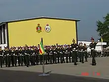 A passing-out parade at the RMC's marching grounds, also known as the parade square. The building in the foreground is the Tun Templer Hall.