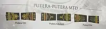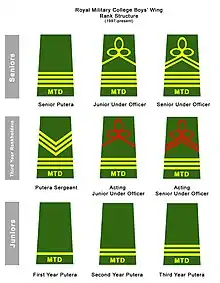 As of 2009, new epaulettes were introduced for the Puteras following the changes in first year intakes from Form 2 to Form 4. The first year Puteras (or New boys) initially wears a pair of epaulettes having only one yellow horizontal bar above the MTD acronym. Later on, some of the Puteras who are promoted to A.P/SGT wears a pair of epaulettes consisting one red horizontal bar above the MTD acronym and three red chevrons pointing downwards. The A.P/SGT are the Puteras that will take up the senior ranks of the Company in the following year.