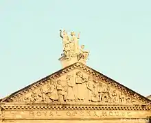 The Opera House is built in a mixed classical design featuring a blend of European and Indian architectural styles. The design was conceived in 1908 by Maurice Bandmann, an entertainer from Kolkata and his partner Jehangir Framji Karaka, who was the head of a firm of coal brokers.[11] It was built with exquisite Italian marble on a leased land close to the Kennedy and Sandhurst bridges. Although the work was completed in 1912, several additions were made until 1915. The pediment figure at the pinnacle was substituted with three cherubs. A pair of unique crystal chandeliers, called the ‘Sans Souci’ were donated by the Sassoon family. The chandeliers, which were earlier located in the Sassoon mansion, were shifted to the foyer of the opera house. At the main entrance, the dome is segmented into eight different parts "as a tribute to poets, dramatists, novelists, literati and people from art and culture." The original interior of the opera house consisted of orchestra stalls with cosy cane chairs. Behind the stalls were 26 rows of boxes with couches. The seating enabled a clear view of the stage to all the people seated in the stalls and in the Dress Circle. The acoustics were of the opera house were created by shaping the ceiling in a manner that permitted distinct audibility that allowed the audience seated in the gallery to hear every word or song from the stage. The entrance was originally designed with a frontage for carriages to drive in.[1][3][8][12]