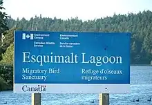 Esquimalt Lagoon is a beach and wildlife preserve with a view of Hatley Castle, Royal Roads University in the background. A small plaque on a concrete cairn in the shore of the Esquimalt Lagoon outlines its history. "Royal Roads - To seaward lies an anchorage or roadstead first used in 1790 by the Spanish and named in 1846 for its location between Albert Head and Victoria. Unloading place for large vessels serving Victoria in days of sail, it was once a scene of disaster. On April 1, 1883 a southeasterly gale swept the haven, beaching the ships Southern Chief, Gettysburg, Connaught and Tiger. Province of British Columbia. Erected by the Thermopylae Club 1973."