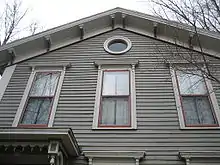 The home is cast in the Classical Revival architectural style. The house was built by Routt, who later became the first governor of the state of Colorado.[1] Simple in its design, the exterior of the house has remained almost unchanged since the late 19th century, and possibly before that.[4] The front of the house and the end of its gabled roof face East Grove Street to the south. The second story features three rectangular windows, with a circular window gracing the gable end at the third floor attic. At its front and back ends, the roof is supported by shallow wooden brackets. The double front door has a small flat roof overhanging it, and the west side of the house features a bay window.[1][4]