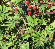 Rubus laciniatus is a deciduous, bramble-forming shrub growing to 3 meters (10 feet) tall, with prickly shoots. The leaves are palmately compound, with five leaflets, each divided into deeply toothed subleaflets with jagged, thorny tips. The flowers have pink or white petals. Fruits are similar to the common blackberry, with a unique, fruitier flavour.[4][5] The fruits are not true berries in the botanical sense.