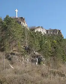 The Ruckenkreuz (Rucken Cross) is an 8.4 metre tall, 2.80 metre wide memorial cross of reinforced concrete. It stands on a rocky mountain at Blaubeuren, Baden-Württemberg, Germany, in memory of the inhabitants of Blaubeuren killed in World War I. The Ruckenkreuz was completed on November 21, 1926.