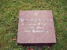 Schmundt was one of the casualties of the failed 20 July plot, planned to kill the German dictator Adolf Hitler. One of the conspirators, Colonel Claus von Stauffenberg, placed a bomb in a briefcase beside Hitler. Colonel Heinz Brandt moved it behind a heavy table leg and unwittingly saved Hitler's life, but as a consequence, he lost his own. Severely injured in the assassination attempt, losing his left eye and suffering shrapnel wounds to both legs, Schmundt initially made a promising recovery, but ultimately died of complications resulting from his injuries on 1 October 1944 at the Carlshof hospital.[3]