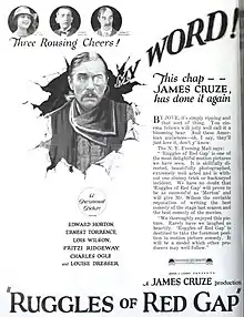 Ruggles of Red Gap is a 1923 American silent Western film directed by James Cruze and written by Anthony Coldeway and Walter Woods that was adapted from the novel by Harry Leon Wilson. The film stars Edward Everett Horton, Ernest Torrence, Lois Wilson, Fritzi Ridgeway, Charles Stanton Ogle, Louise Dresser, Anna Lehr, and William Austin. The film was released on October 7, 1923, by Paramount Pictures.[1][2][3]