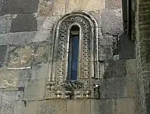 The sanctuary is flanked by pastophoria on either side, connecting to the corresponding naves with arched openings. Both are covered with domical vaults, supported by four squinches. The sanctuary is separated from the rest of the bay by an ornate wood-engraved iconostasis installed in 1781. Fragments of the late medieval frescoes are visible in part of the interior. The dome has tinplate roofing; the rest of the roof is tiled. The façades are adorned with decorative stone carvings, especially around the doorways and windows.[2] A special decorative feature of the cathedral is polychromy, both exterior and interior. The façades and the interior of the northern aisle are laid out in colorful quadras. The ornament of the apse floor is adorned in three color stones. Fine ornamentation covers cornices.
