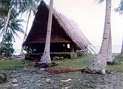 The Rull Men's Meetinghouse (known as a faluw in the Yapese language) is a historic meeting house in Rull, a village on the island of Yap in the Federated States of Micronesia. It is a large rectangular structure, set on a raised stone platform. The flooring consists of treated betelnut palm trunks, and has a steeply pitched roof made of bamboo supports with various types of tropical leaves tied in place using coconut fiber. The faluw, although not the first built on this platform, has historically occupied a central place in the civic life of the community, serving as a place where the men of the village could meet in seclusion, and as a place for social rites.[2]