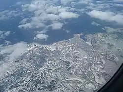 Aerial view of the city of Rumoi, with the Rumoi River at right