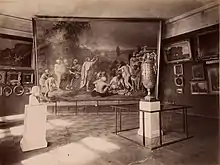 Its collection included paintings from the Old Masters and some more recent artists.[9] Fyodor Pryanishnikov's collection was part of the museum.[35] Leonid Pasternak's painting of Tolstoy was hung there.[47] Pavel Tretyakov gave the museum Vladimir Borovikovsky's "Portrait of Amvrosy Podobedov".[35] In 1862 the Ahasuerus and Haman at the Feast of Esther was given to the museum.[48] The collection included the Archangel Gospel.[49] Ivan Tsvetaev was a curator until he went on to found the Pushkin Museum in 1912.[19]