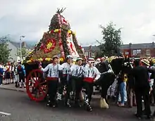 France and Woodall in their A New History of Didsbury give the text of an anonymous account of the rushcart perhaps of the 1860s and entries in the churchwardens' accounts for 1733 and 1808 among other statements recorded by local people. It is uncertain when the rushbearing was ended in Didsbury, certainly not before 1870. The associated rowdyism was not thought desirable by the more sober parishioners of the time according to Alfred Burton in his Rushbearing.[5] However Fletcher Moss's Fifty Years of Public Work includes photographs of the Didsbury rushcarts of 1882 and 1911, the last occasion. (If the dates are genuine Burton is either mistaken or it was discontinued for some years and then revived.) In the nearby township of Chorlton cum Hardy, the ceremony took place on the eve of the last Sunday in July though very little is known about how long it continued to be observed.[6]