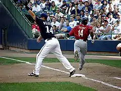 On July 27, Branyan hit the longest home run in Miller Park history off Chicago Cubs pitcher Greg Maddux.[42] The ball went an estimated 480-feet.[42] On August 18, Branyan hit two home runs against the Chicago Cubs and drove in all five runs for the Brewers in a loss.[43] Branyan went 3-for-4 in his second multi-home run game of season (ninth of his career) on September 12, against the Cincinnati Reds.[44] Branyan hit .279 with 26 homers and 79 RBIs in 93 games at the Triple-A level in 2004,[10] and posted a .234 batting average with 11 homers, and 27 RBIs in 51 games with the Brewers.[1] He hit six home runs in his first 14 games with Milwaukee.[45] He played 44 games at third base (40 starts), and two games at first base (one start).[45] On December 21, the Brewers resigned Branyan, avoiding salary arbitration.[46][47]