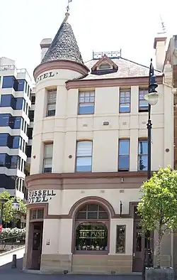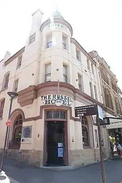 The Russell Hotel is a heritage-listed hotel located at 143–143a George Street, in the inner city Sydney suburb of The Rocks in the City of Sydney local government area of New South Wales, Australia. It was built in 1887. It operated as the Port Jackson Hotel until being delicensed in 1923, after which time a new Port Jackson Hotel was built further along George Street. In 1933, it became the Russell Private Hotel, providing accommodation from the upper floors. The ground floor has been leased for various uses since the original delicensing, initially as a cafe for several decades and most recently as a restaurant and bar. The property is owned by Property NSW, an agency of the Government of New South Wales. It was added to the New South Wales State Heritage Register on 10 May 2002.[1]