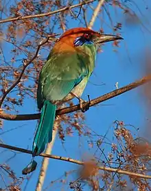 The russet-crowned motmot (Momotus mexicanus) is a species of motmot native to north-western Mexico and central Guatemala.[2][3][4][5][6][7] It is a year-round resident[6][7] of the tropical and subtropical dry broadleaf forests[4][5][6] and scrubland.[2] The russet-crowned motmot is the most understudied species of motmot in the family Momotidae.[3]