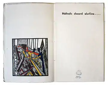 Russian Ballet is an artist's book by the English artist David Bomberg published in 1919. The work describes the impact of seeing a performance of Diaghilev's Ballets Russes, and is based on a series of drawings Bomberg had done around 1914,[1] while associated with the Vorticist group of avant-garde artists in London. Centred on Wyndham Lewis and Ezra Pound, the movement flourished briefly from 1914–1915, before being dispersed by the impact of the First World War. The only surviving example of a vorticist artist's book, the work can be seen as a parody of Marinetti's seminal futurist book Zang Tumb Tumb, using similar language to the Italian's work glorifying war (for example, the phrase "Methodic discord startles ..."[2]), but instead praising the impact of watching the decidedly less macho Ballets Russes in full flow.