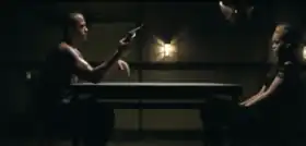 The music video opens with shots of Rihanna hooded, lying on the floor of a gas chamber. Three men, dressed in black uniforms and wearing dark round glasses circulate the singer, attempting to extort information from her. The scene then moves to a dimly lit room in which Rihanna sits at a table with her love interest (played by American actor Jesse Williams) opposite. On the table between them lies a silver revolver in which, throughout the video, they take it turns holding to their heads. Other scenes include Rihanna in woodland at night standing in the middle of a highway before a car speeds towards her, quickly cutting to another scene, giving the impression she is run over. Elements of blood and tears and vehicular assault dominate the video.[67] In the final scenes, Rihanna is shown underwater, floating while being fired at; one bullet is visually seen cutting her throat. The video ends with her lover committing suicide with the revolver placed between them.[69][70]