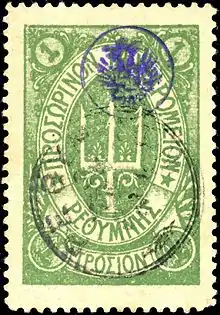 Regularly printed stamps came out later in 1899, printed by Grundman & Stangel of Athens, using a design based on Poseidon's trident. They came in three values, one and two metallik and one grosion (equivalent to four metallik or one piastre), and seven colors (orange, green, yellow, rose, lilac, blue, and black). A third set was issued using a variation of this design, adding five-pointed stars in the frame around the trident, and was printed in blue, rose, green, and lilac.