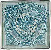 The first postage stamp of the offices was a large square design issued in 1863 and valued at six kopecks. This type is today rare, as were the normal-sized 2k and 20k stamps issued in 1865, which included a sailing ship along with the imperial coat of arms, and "ROPiT" in the inscription. A similar but better-executed design appeared in 1866.