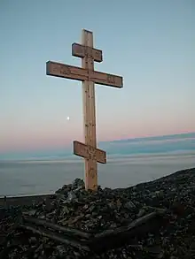 On 26 July the expedition met Sergei Tolstov, a sailor from the 1900–1902 expedition who was left on Faddeyevsky Peninsula to wait for Toll, whose traces were not found anywhere.[10] Further on Cape Vysoky they met Brusnev, who was also left by the previous expedition to assist Toll, and rested at his camp for a day.[10] From Cape Vysoky, the team traveled through open waters, using sail and oars,[11] and on 4 August reached the Bennett Island. There, on Cape Emma, Kolchak found a bottle with a note from Toll and map of the island.[12]