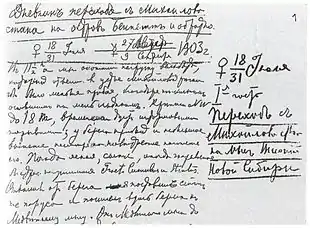 Already by 16 January 1903, Kolchak had received first payment for the expedition. Because of this assignment, he had to postpone his planned wedding to Sofia Omirova.[6]