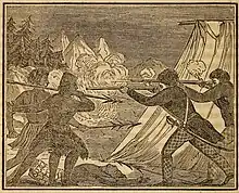 The Hoh kept the four passengers on the other canoe, two Alaska Natives, one of the promyshlenniki, and Anna Bulygina, the 18-year-old wife of expedition commander Nikolai Bulygin, as hostages.[3] After this incident the free Nikolai staff began to aimlessly wander through the coastal forests. In despair from losing his wife, Bulygin appointed Tarakanov to lead the remaining party. Starvation quickly became an issue, temporarily allayed when a village was found on 27 November [O.S. 15 November]. The lodges were abandoned outside of one teenager, who informed them of the inhabitants fleeing upon becoming aware of their presence. "Each of us grabbed twenty-five fish in bundles" Tarakanov later reported, and an estimated 25 native warriors tracked down the men soon after.[4] While none of the crew were grievously injured in the ensuing fight, it pushed them into the interior.