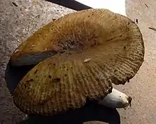 The cap is spherical when young, later broadly convex and can be flat when old. It is dull ochre and covered in a grey slime, up to 15 cm in diameter. The gills are pale cream and close together, giving off a scent of bitter almonds when rubbed. The spores are also pale cream. The stem is white and becomes blotchy with age.