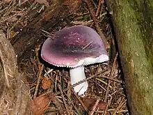 The rare Russula azurea also has a purple cap and grows beneath spruces. Russula amethystina can hardly be distinguished from this mushroom, its blue to reddish-violet cap occasionally has pale patches and also a smell of iodine in the stem base. It can be found in coniferous mountain forests, mostly under silver fir.
