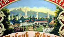 - Trommlerball ("drummers' ball") on the following Thursday night is a dance ball and society event organized by the Trommlerkorps der Gymnasien, roughly comparable to a débutante ball. All Trommlerkorps members take part in social dances with their Trommlerbraut ("drummer's bride"). Initially held at the Konzerthaus until ca. the 1960s, the ball was held in the congress centre in the neighbouring town of Weingarten until 2017 and again from 2022.[9] In 2018 and 2019, the ball took place in the Oberschwabenhalle multi-purpose hall in Ravensburg. The Trommlerball attracts between 500 and 1,000 guests.[10]