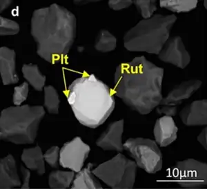 Rutheniridosmine occurs in association with sperrylite, hollingworthite, iridarsenite, ruthenarsenite, michenerite, laurite, geversite, moncheite, and chromite.[2]