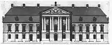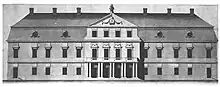 Ruzhany Palace was rebuilt as a grand Neoclassical residence in the 1770s by Aleksander Michał Sapieha, employing the services of the architect Jan Samuel Becker of Saxony, who set the palace in an English park landscape.[2] Aside from the palace, there was a theatre (1784–88), an orangery and several other outbuildings. Becker also designed the local church (rebuilt in the 1850s).
