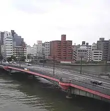 The Ryōgoku Bridge (両国橋, Ryōgoku-bashi) is a bridge in Tokyo built in 1659 spanning the Sumida River just upstream of its confluence with the Kanda River. Its name, meaning "two provinces", came from its joining Edo (the forerunner of Tokyo in Musashi Province) and Shimōsa Province. The neighborhood at the east end of the bridge, Ryōgoku, derived its name from that of the bridge. The bridge featured in the 2015 anime "Miss Hokusai".