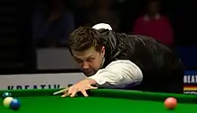 Day advanced to the quarter-final stage of the Shanghai Masters by overcoming Neil Robertson and Mei Xiwen, both 5–2, before losing 3–5 to Mark Selby.[35] He won the first four frames against Mark Allen in the third round of the UK Championship, but went on to lose 6–5.[36] His second quarter-final of the season came at the German Masters and he was defeated 2–5 by Martin Gould.[37] At the World Grand Prix, Day overcame Stuart Bingham, Michael White and Shaun Murphy all 4–2. In the semi-finals he was 3–4 down to Marco Fu, but recovered from needing four snookers in the eighth frame to level and went on to win 6–4.[38] In Day's first ranking event final since 2008 he was 9–3 behind Barry Hawkins and, though he pulled it back to 9–7, he was defeated 7–10.[39] Day lost in the final of the non-ranking Championship League 0–3 to John Higgins.[40] A 4–2 win over Neil Robertson saw Day play in the semi-finals of the Gibraltar Open and he was beaten 4–2 by Judd Trump after leading 2–0.[41] Day was a seeded player for the World Championship, but lost 4–10 Xiao Guodong in the first round and once again blamed his lack of concentration for the early exit.[42]