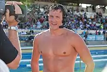 At the 2009 National Championships, the selection meet for the 2009 World Aquatics Championships, Lochte won individual titles in the 200 and 400-meter individual medley.[56][57] Lochte also qualified to swim in the 4×100 and 4×200-meter freestyle relay.[58][59] In the 200-meter backstroke final, Lochte placed second behind Aaron Peirsol, and lost his world record he set in Beijing when Peirsol recorded a time of 1:53.08.[60]