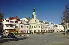 The historic town centre is formed by Staré Square. It comprises preserved burgher houses and Neoclassical former town hall from 1802–1804, which serves today as the tourist information centre. Near the square there is the Church of Saint Gall. It was built in the late 13th century and repaired in the pseudo-Gothic style in 1893. The bell tower was built in the pseudo-Romanesque style in 1870–1871.[9]