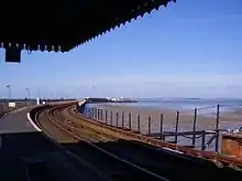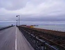 A second 'tramway' pier was built next to the first, opening on 29 August 1864.[3] Horse-drawn trams took passengers from the pier head to the esplanade. Before construction of the railway pier, the tramway continued to Ryde railway station at St John's Road. From 1886 to 1927, the trams were powered by electricity from a third rail, and from then until 1969 were petrol-powered.[4]