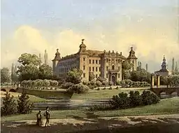 The Rydzyna Castle [rɨˈd͡zɨna] is a Baroque castle in Rydzyna, Poland. It was built in the beginning of the 15th century by Jan of Czernina. At the end of the 17th century, Italian architects Joseph Simon Bellotti and Pompeo Ferrari erected the present Baroque castle on its ancient foundations. The first owners of the castle were the Leszczyński family. Together with a park and surrounding areas, it was one of the most splendid palaces in Great Poland.[1]