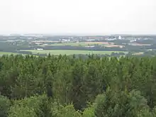 Bornholm has both varied natural features, such as Almindingen, Hammeren, Jons Kapel, Paradisbakkerne, and Dueodde.[7] Rytterknægten in the Almindingen forest is not far from Ekkodalen ("echo valley") to the east and the Gamleborg castle (Viking fortress) to the southwest. The memorial tower is on the western side of the elevated area. The entire surroundings are covered with dense forest, which has been growing and creating obstructions to the views from the tower.[8]