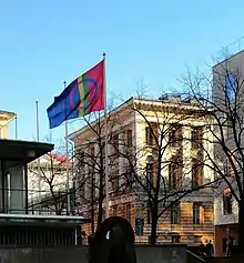 Since then, celebrating the day has become increasingly popular. In Norway it is compulsory for municipal administrative buildings to fly the Norwegian flag, and optionally also the Sami flag, on February 6. Particularly notable is the celebration in Norway's capital Oslo, where the bells in the highest tower of Oslo City Hall play the Sami national anthem as the flags go up.[2] Some larger places have taken to arranging festivities also in the week around the Sami National Day. The National Day has been included in the almanacs published by the University of Helsinki since 2004.[3] The Norwegian, Swedish and Finnish authorities recommend general flagging on the day.[3]