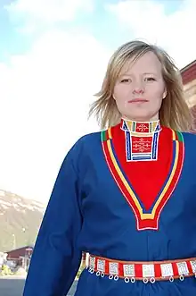 Sámi costume is the traditional clothing that reveals ethnicity of the Sami people in Northern Scandinavia and the Kola Peninsula. The style of clothing varies among regions and language groups, but there are many common or similar elements. Traditional elements are often included in modern Sámi clothing to signify Sámi identity.[1][2]