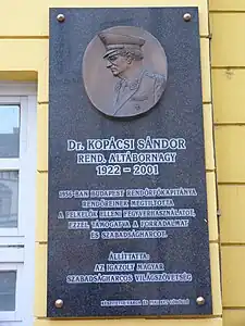 Commemorative plaque of Sándor Kopácsi in Budapest District VIII, Corvin Alley No 1 (Corvin Movie Theater)
