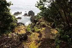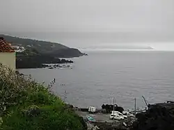 ![]() The coast along São João, showing village, looking towards the summit of Pico, in the west | |