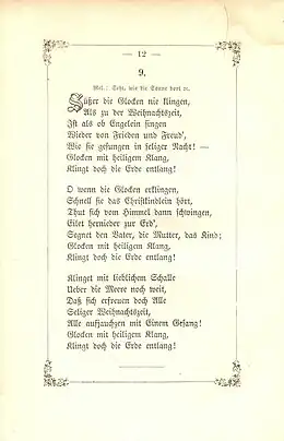 Ludwig Tiesmeyer, Paul Zauleck (Hrsg.), Helias Putsch (musikalisch bearb.): Das Buch der Weihnachtslieder. 2., völlig neu bearbeitete Auflage. Heinsius, Bremen 1896, p. 106 f. (Wikisource). - 1 2 3 Nicolai, Claudia (14 December 2014). "Süßer die Glocken nie klingen". lieder-archiv.de (in German). Retrieved 17 December 2020.