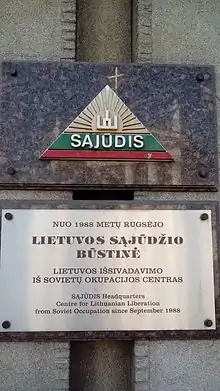Sąjūdis (Lithuanian: [ˈsâːjuːdʲɪs], "Movement"), initially known as the Reform Movement of Lithuania (Lithuanian: Lietuvos Persitvarkymo Sąjūdis), is a political organisation which led the struggle for Lithuanian independence in the late 1980s and early 1990s. It was established on 3 June 1988 as the first opposition party in Soviet Lithuania, and was led by Vytautas Landsbergis. Its goal was to seek the return of independent status for Lithuania.