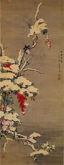 Shiseki's bird and flower paintings and other works display the use of a combination of broad calligraphic brushstrokes for branches, tree trunks and rocks, ink wash and color for flower petals and leaves, and much finer brushstrokes for the fine details of feathers and flowers to produce a very detailed and lifelike, realistic depiction. Returning to Edo, Shiseki became a prominent representative and teacher of the Nagasaki school in that city, teaching Shiba Kōkan among others.[2] He was close with such rangaku scholars as Hiraga Gennai and Sugita Genpaku, and expressed an interest in Western painting.[1] Rather than his stylistic choice coming straight from European painting, however, scholar Meccarelli thinks Shiseki matured Nanpin school’s “flora and fauna decorative painting”.[3] His style is indeed more focused on details, also lending credence to the legacy left by botanic manuals and scientific treatises. He composed a number of books, and woodblock printed volumes of his artworks were produced as well.[2]